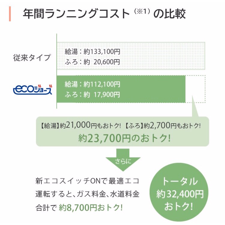 ●トータルコストを低減…従来のガス給湯器より購入時は高額ですが、ランニングコストが安いので、トータルで考えると安くなります。また省エネ性に優れたエコジョーズは、国からの補助金を受けられます。