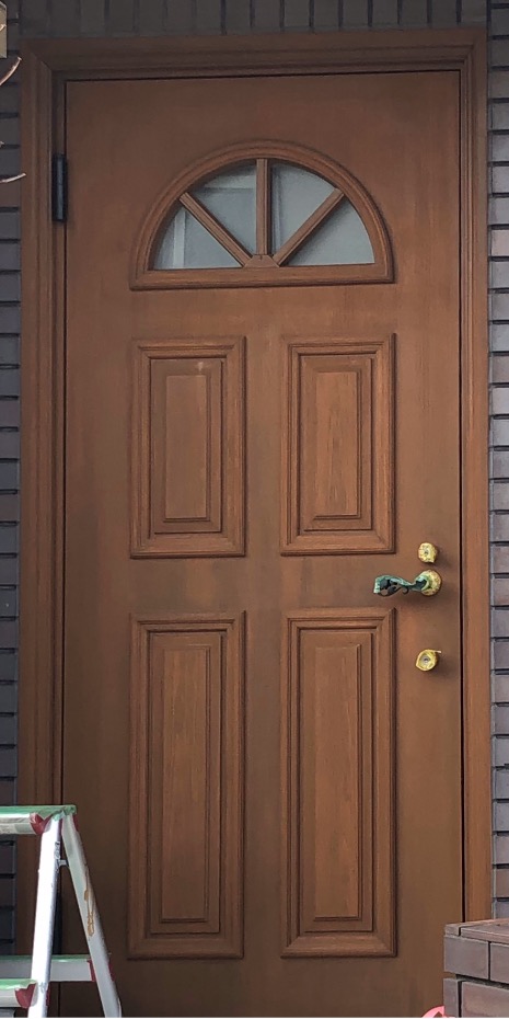 少し濃い色にすることでアラ隠しとキレイな木製の玄関ドアに変身することができます。