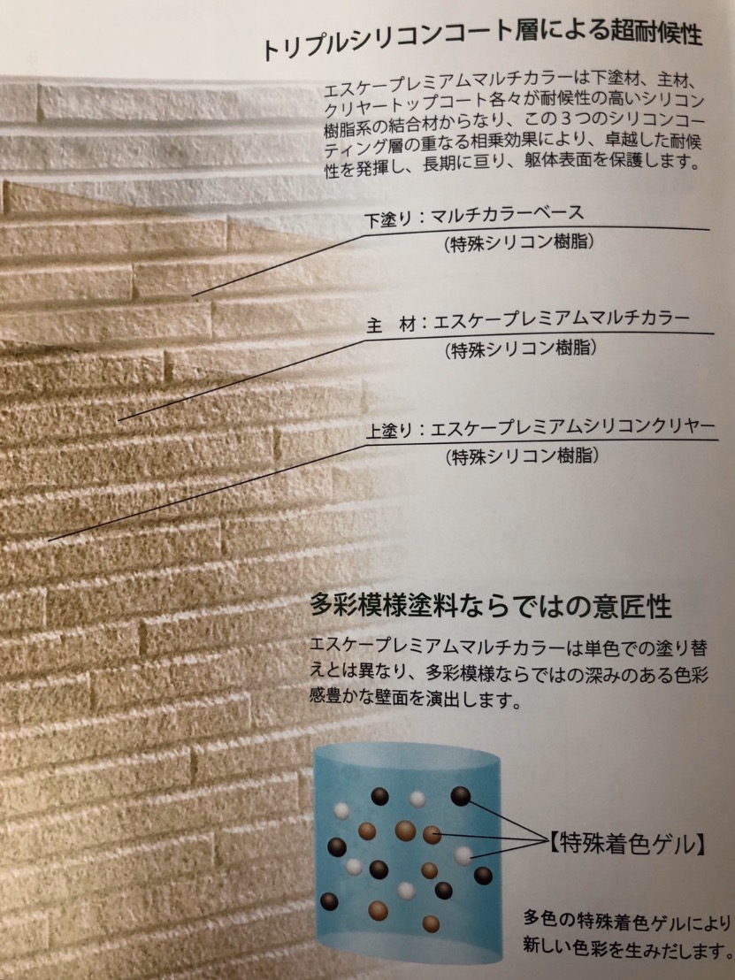 いままでサイディングの塗り替えや塗装では、単色が多くデザイン性や意匠性の優れた多彩模様塗料での塗り替えが少ない状況でしたが、こちらのエスケープレミアムマルチカラーは超耐候性にも優れた塗料で、しかも躯体の保護性やトリプルシリコンコート層で様々な外壁の塗り替えや塗装にも可能なマルチカラーの塗料になります。