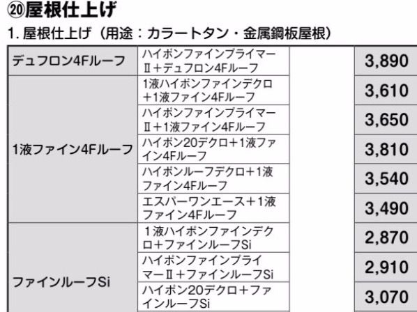 こちらが日本ペイントの屋根塗装の積算定価表になります。