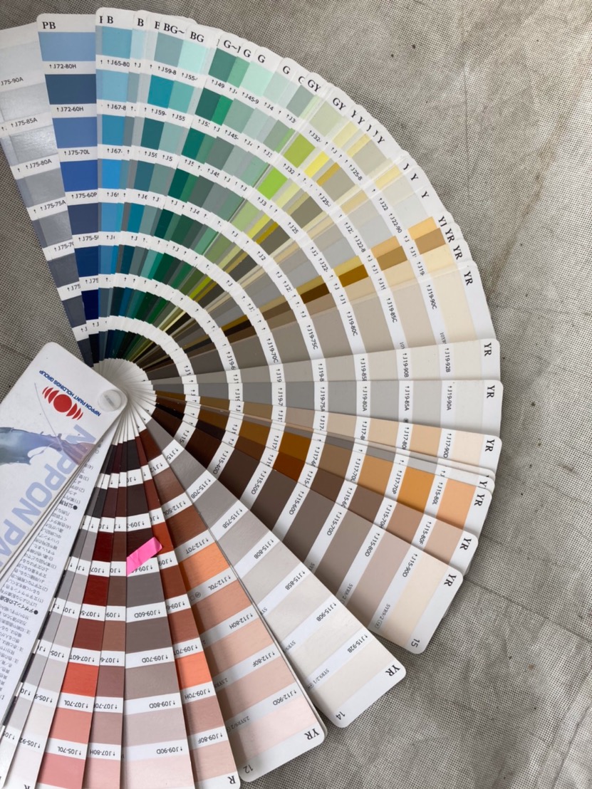 仮に黄色としても、黄色のグラデーションみたいな見本から色を選びたいとのご希望があり、取引先の塗料問屋の担当者に話して1200色のカラーチャート見本を持ってきてもらいました。