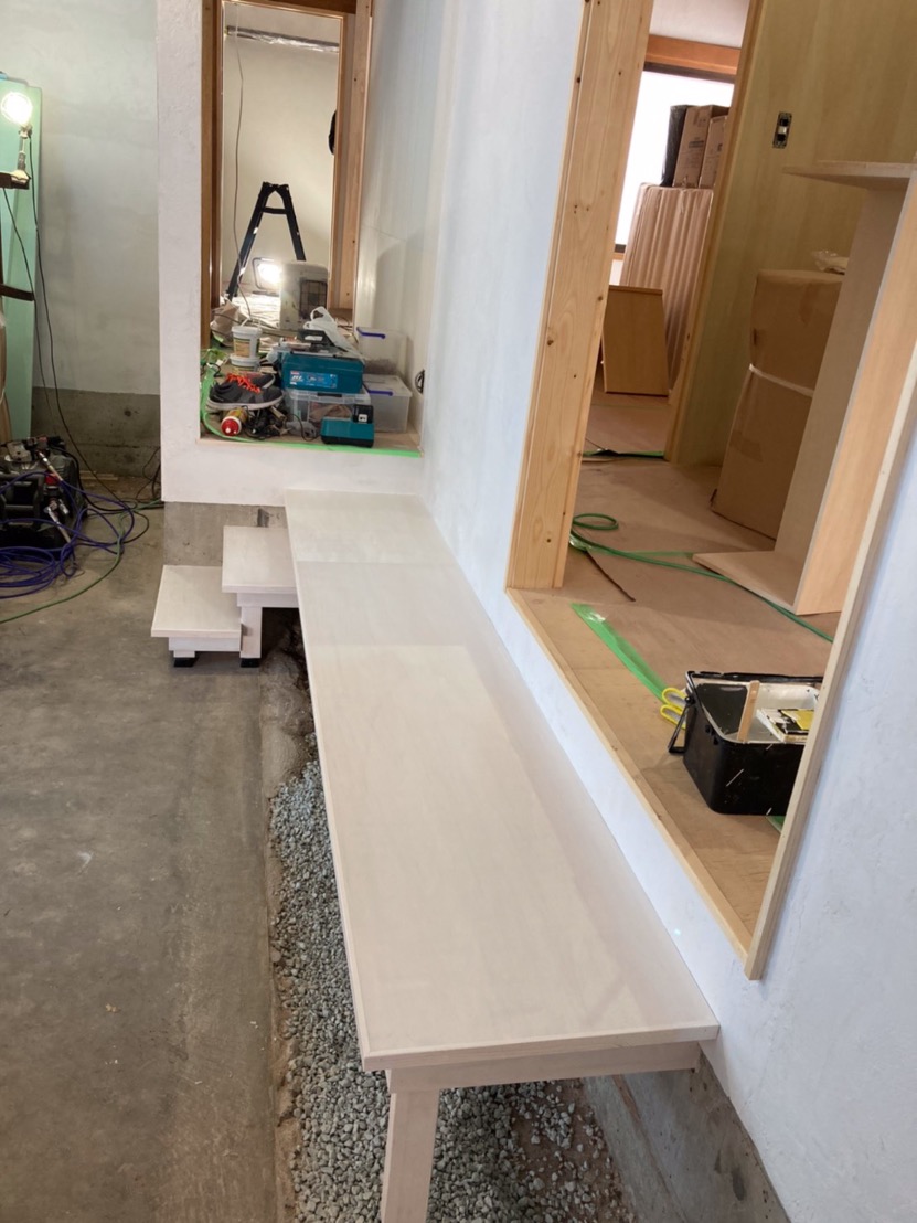 漆喰以外の壁は、シナベニヤを張り、自然塗料のオスモで着色し、拭き取り仕上げでキレイな木目を引き立たせます。