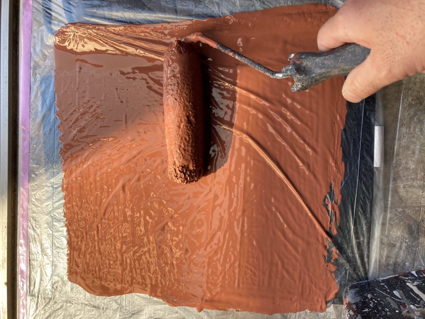 ビニールをの上にローラーで塗料をいつもと同じくたっぷりと塗装。