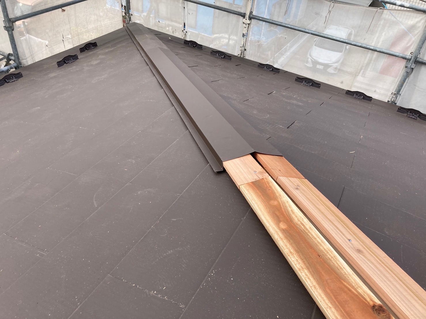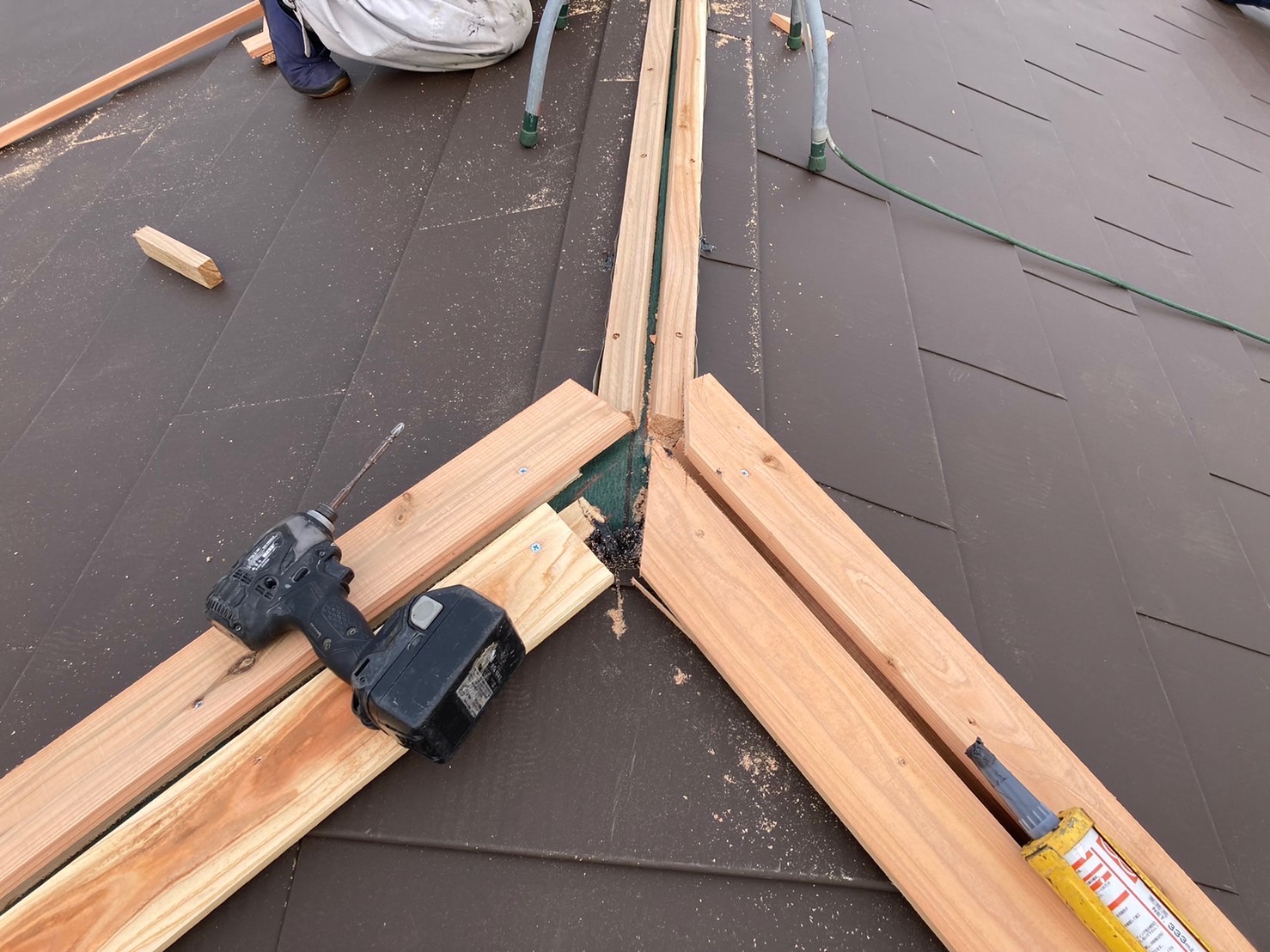 棟板金部分に下地の木材を取付けて、加工した棟板材を取付します。