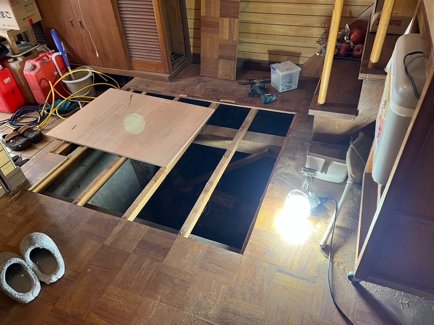 まずは痛んでいる床材周辺を電動ノコギリで切って開口して中の傷み具合を確認。