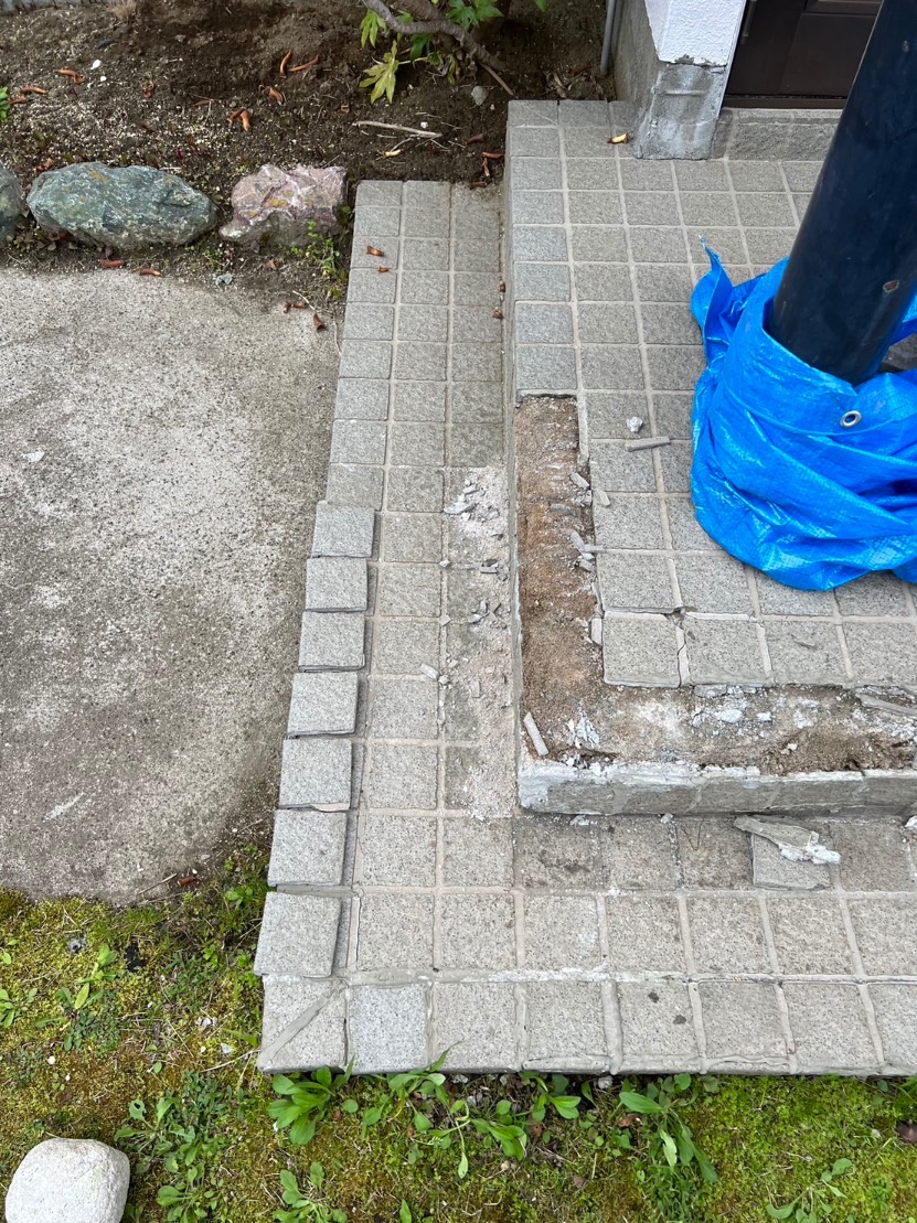 玄関のアプローチタイルが地震などで割れて取れてしまい、旦那さんがご自身でホームセンターで材料や接着剤を購入して、一度はDIYで直されたそうです。
