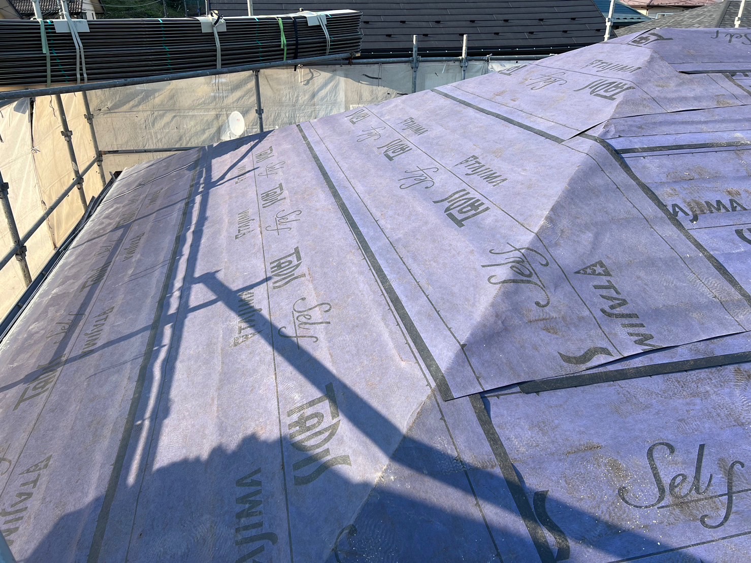 即座にセルフと呼ばれる自着型のルーフィング防水シートを屋根全面に被せて張り付けていきます。